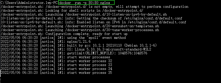 注意:-p指定运行的端口 冒号左侧的80指的是宿主机的端口 冒号右侧的80指的是nginx的默认端口