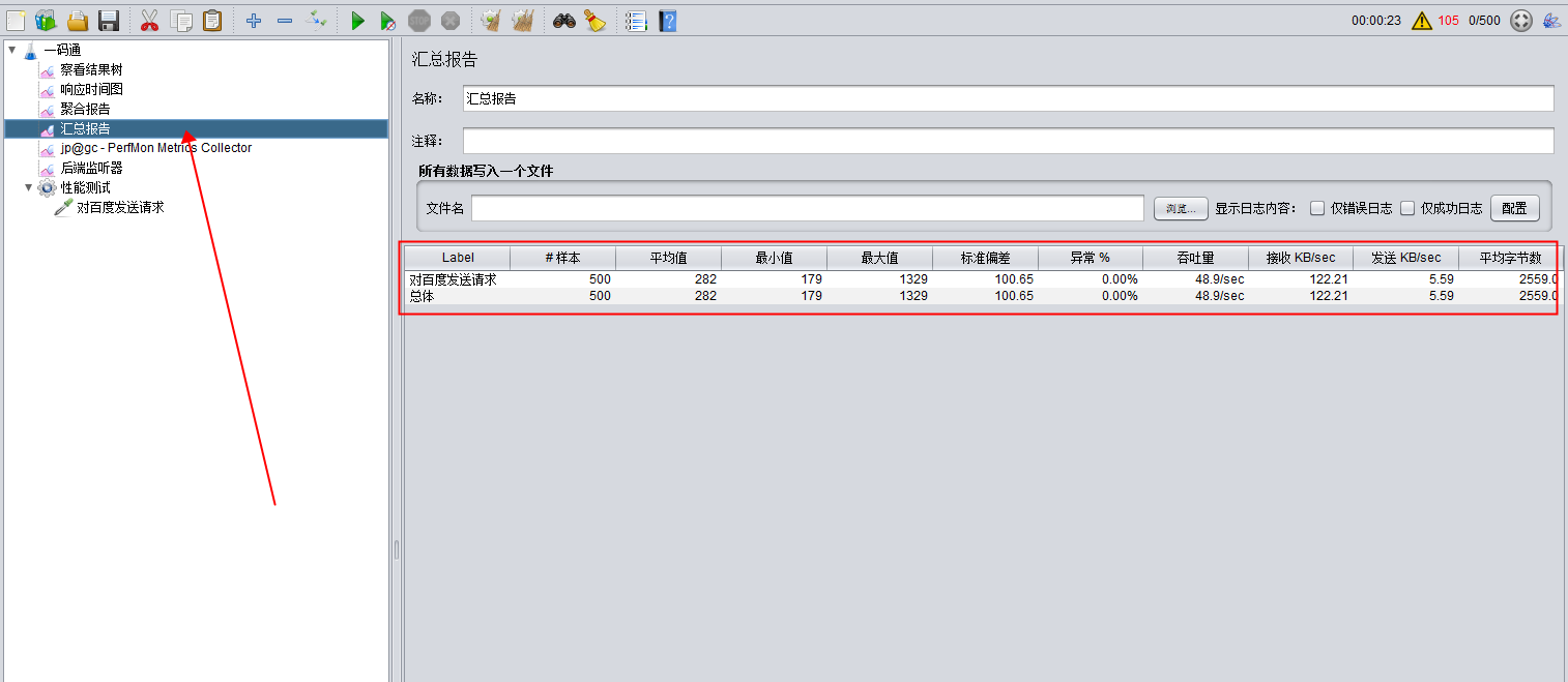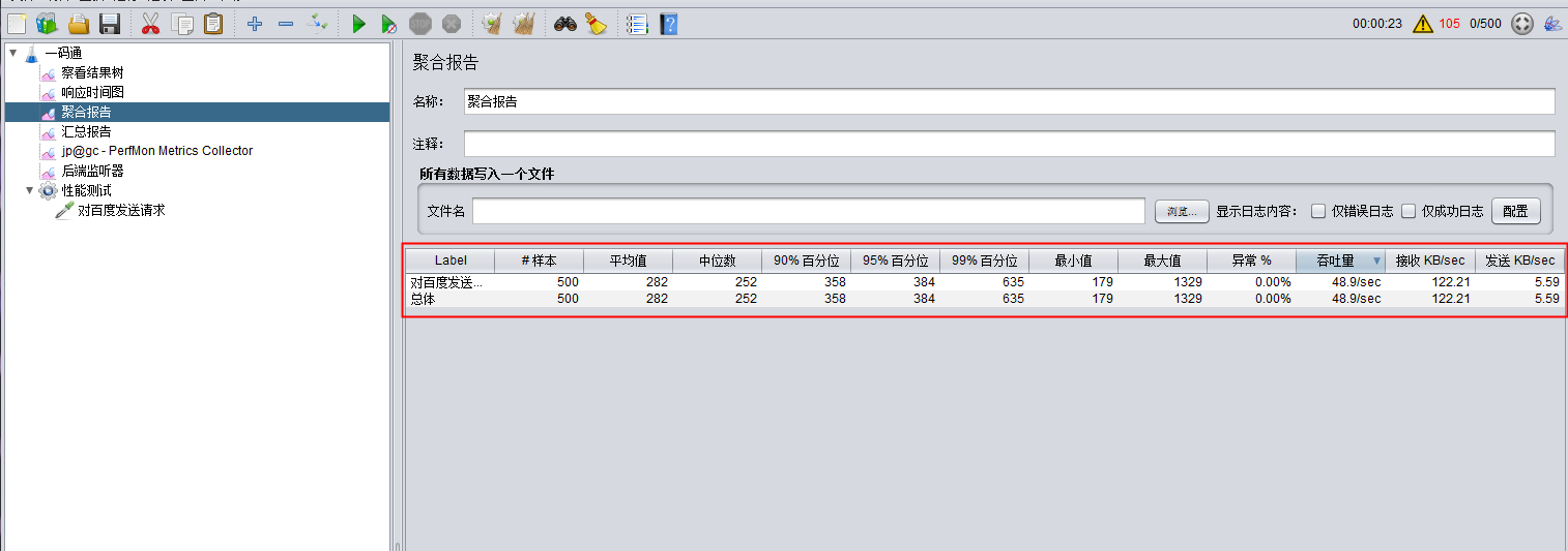 聚合报告里面可以看到吞吐量,最小响应时间,最大响应时间,平均响应时间 ,中位数,90,95,99