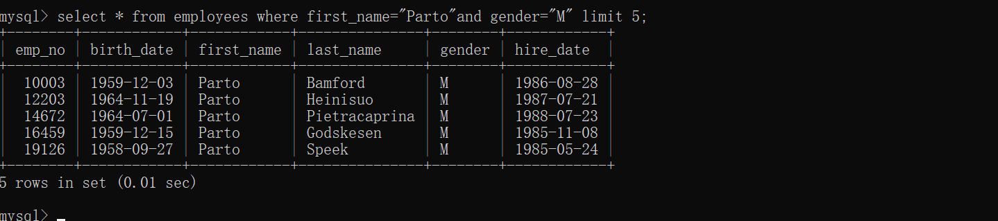 select * from employees where first_name="Parto"and gender="M" limit 5;