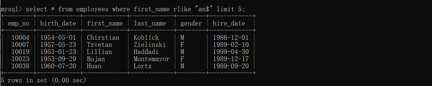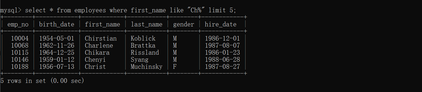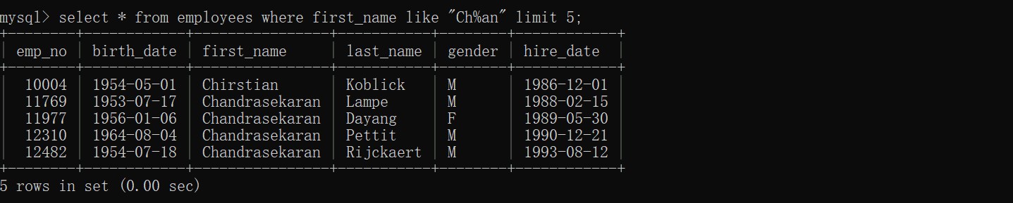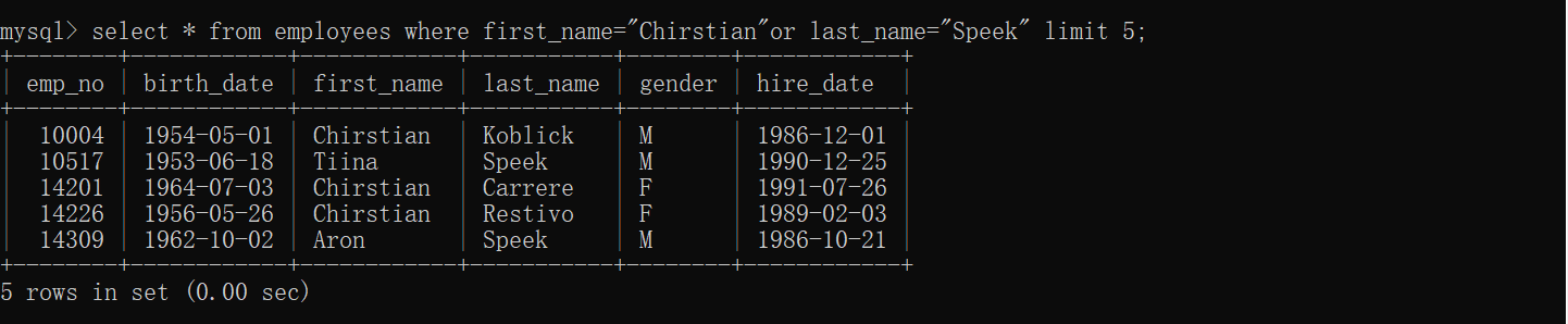 select * from employees where first_name="Chirstian"or last_name="Speek" limit 5;