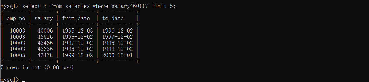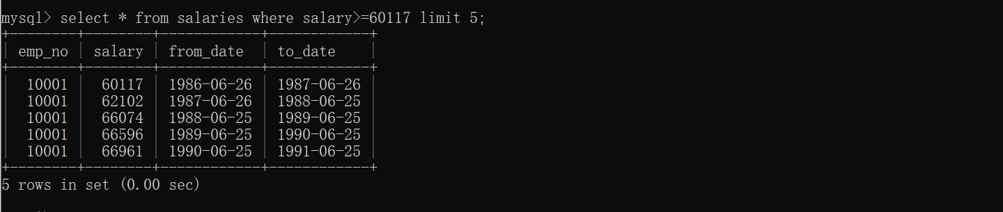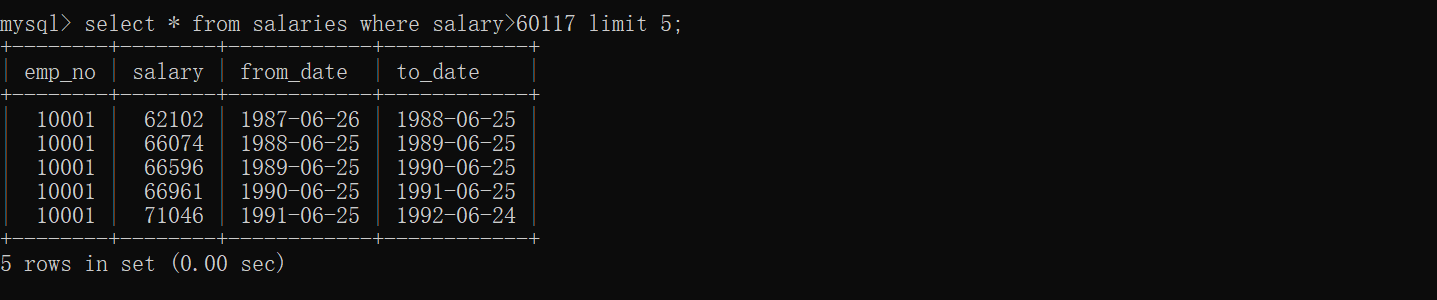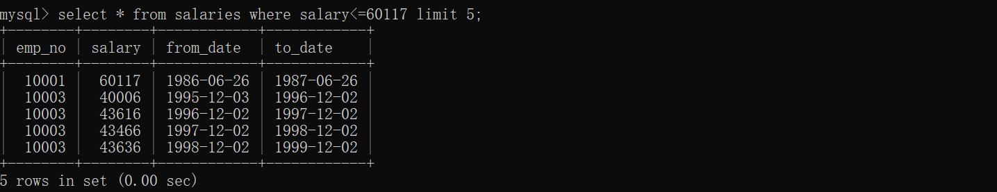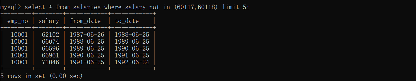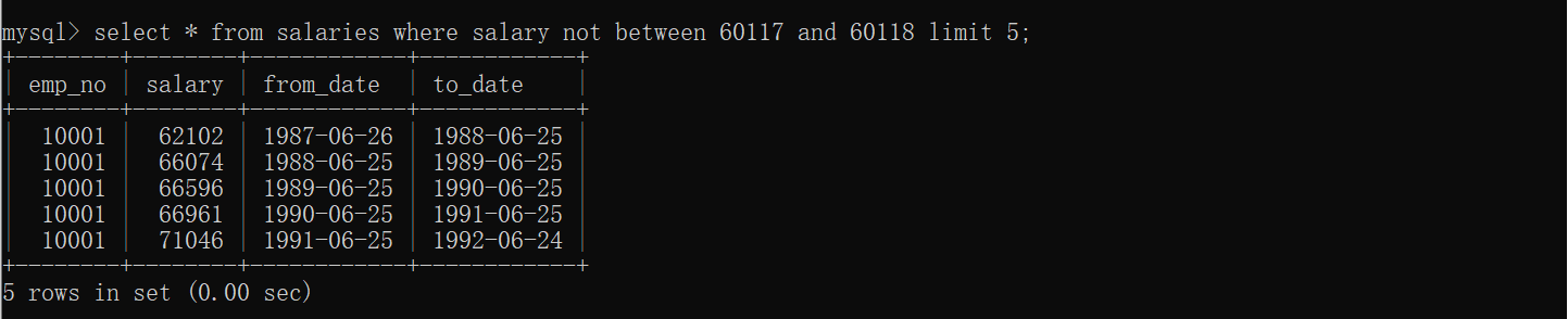select * from salaries where salary not between 60117 and 60118 limit 5;