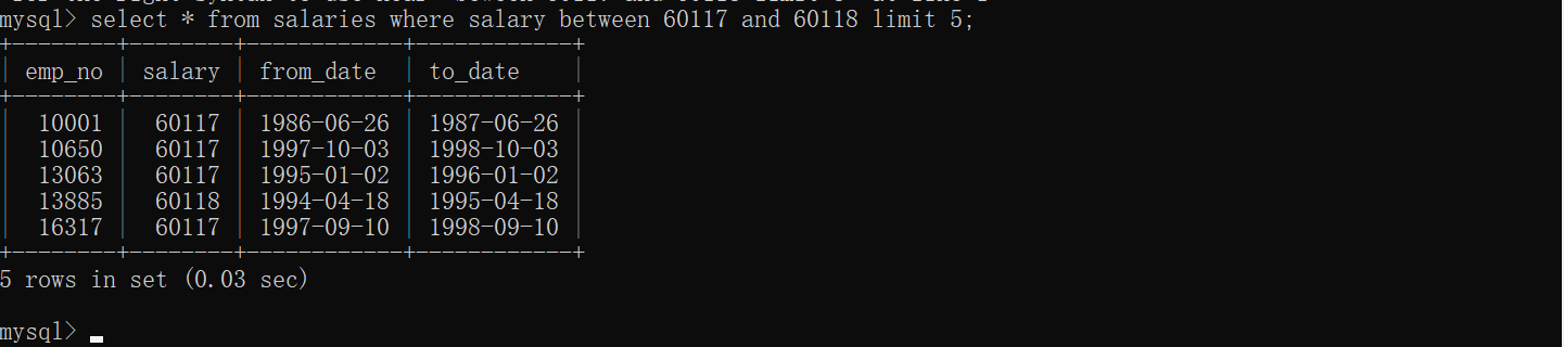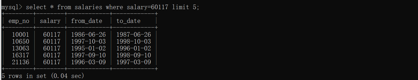 select * from salaries where salary between 60117 and 60118 limit 5;