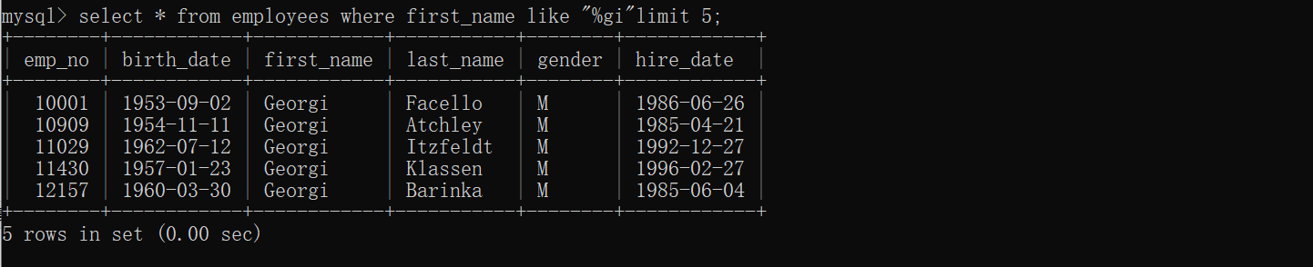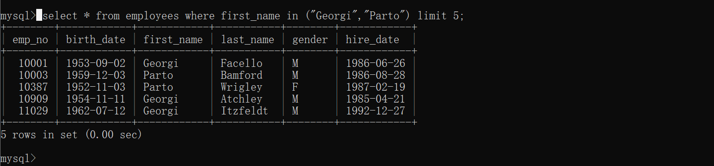 select * from employees where first_name in ("Georgi","Parto") limit 5;