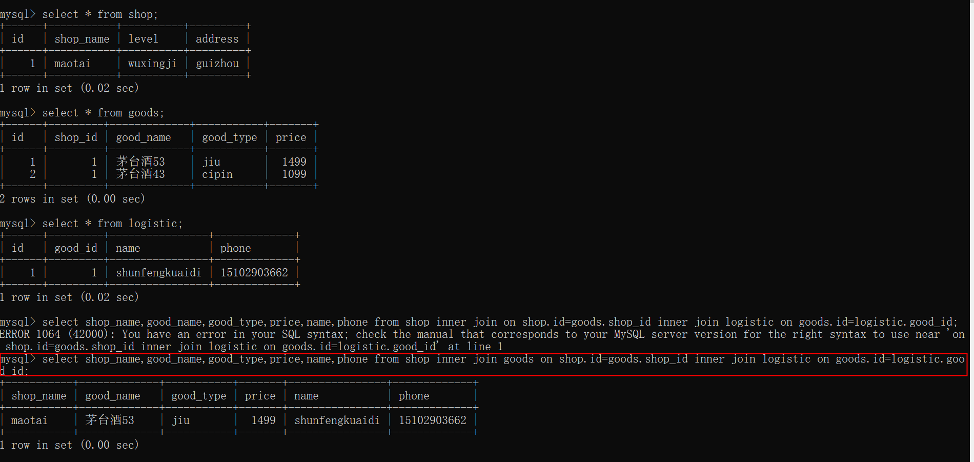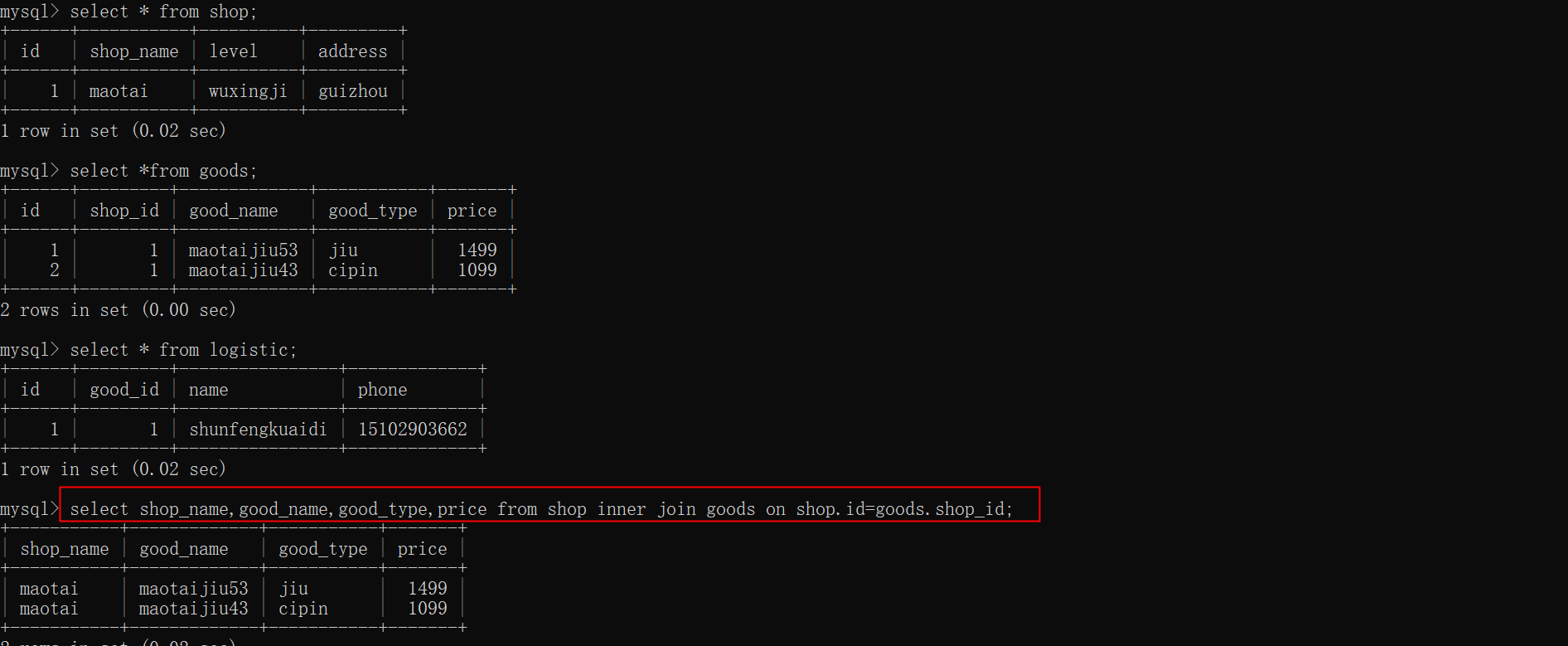 select shop_name,good_name,good_type,price,name,phone from shop inner join goods on shop.id=goods.shop_id inner join logistic on goods.id=logistic.good_id;
