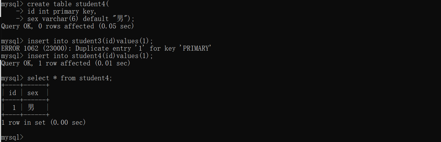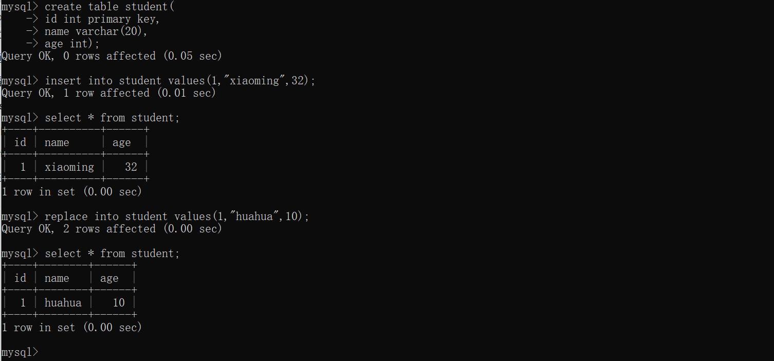 replace:需要处理重复行,行的唯一性由主键约束,如果行存在,使用replace会自动的删除行并插入新行,如果不存在,就等于insert
