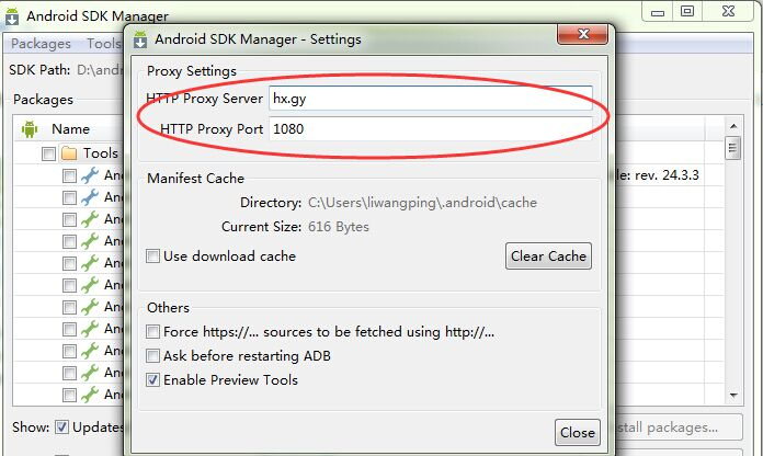 C、打开SDK Manage.exe,点击Tools下拉框,选择Options,设置代理