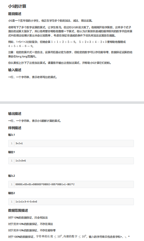大模拟,第一次输入一个数值,后面的都是输入一个符号,一个数字,遇到加法,保留数字*1,遇到减法,保留数字*-1,遇到乘法,前一个数乘上数字,最后排序,求和输出