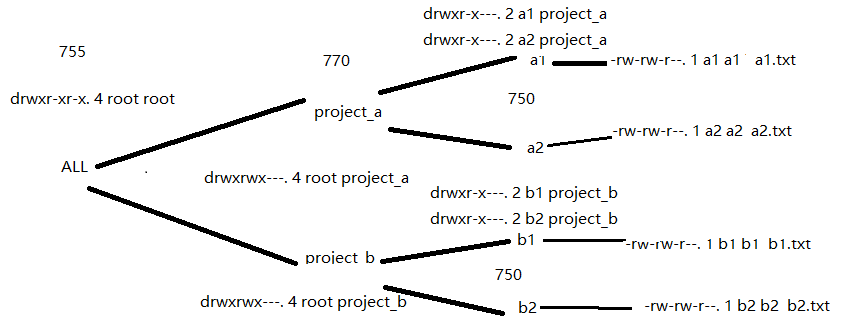 要求:所有文件目录在/all下,project_a下建a1,a2两个目录,project_b下建b1,b2两个目录;项目project_a, project_b之间不可以互相访问;相同部门之间可互相查看文件内容,但不可以修改,用户自己创建的文件自己可以修改。