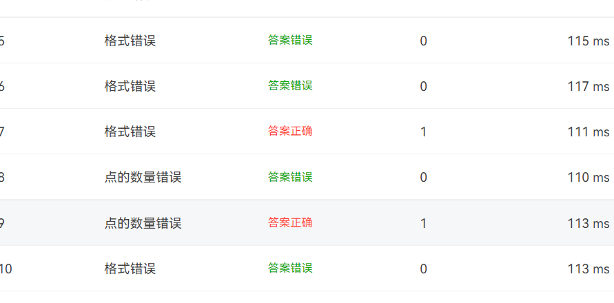 本题主要考核正则表达式的使用,判断两点的数据是否合法以及点的数量是否合格,数据不合格则输出"Wrong Format“,坐标点的数量超过两个,输出“wrong number of points”