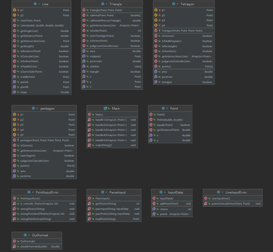 2、类中和方法漏写和判断情况缺失。这个就在图形类中体现得较为明显。涉及几何学得判断时要尤为注意那些情况该图形不存在,哪些情况点是重合的,哪些情况斜率不存在或者斜率为零,三角形哪些情况不成立,哪些情况三角形成为了一条直线等极端情况。