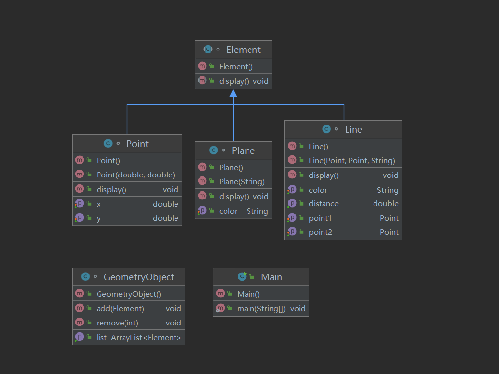 本题为期中考试第三题,考察点在于对题目的类设计进行重构,增加容器类保存点、线、面对象,并对该容器进行相应增、删、遍历操作。题目整体难度有所上升。将第二题建立的Point、Line、Plane类按题干中的类图进行整理并添入题目,沿用Element抽象类继承这三个类。新建立GeometryObject容器类,容器类运用ArrayList,并增添add、remove方法,并通过getList方法实现错误格式的判断。根据题意,主函数使用switch case语句对题干四个选项分别进行实现。本题中需要用到ArrayList集合的操作知识。