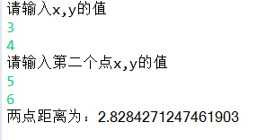 package src.project; public class point { int x;//两个int变量x、y int y; public int getX() {//x访问器 return x; } public void setX(int x) {//x修改器 this.x = x; } public int getY() {//y访问器 return y; } public void setY(int y) {//y修改器 this.y = y; } point(){ x=0; y=0;//构造方法 } double distance(point a,point b) {//计算两点距离的方法 double x1=a.getX(); double x2=b.getX(); double y1=a.getY(); double y2=b.getY(); return Math.sqrt((x1-x2)*(x1-x2)+(y1-y2)*(y1-y2)); } public static void main(String[] args) { } } package src.project; import java.util.Scanner; import src.project.point; public class test { public static void main(String[] args) { Scanner reader = new Scanner(System.in); System.out.println("请输入x,y的值"); point a=new point();//对象 a.setX(reader.nextInt());//修改x a.setY(reader.nextInt());//修改y point b=new point(); System.out.println("请输入第二个点x,y的值"); b.setX(reader.nextInt()); b.setY(reader.nextInt());//同上 System.out.println("两点距离为:"+b.distance(a, b));//打印距离 } }