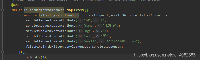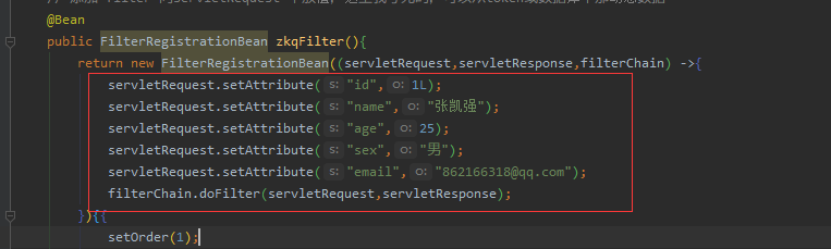 // 添加 filter 向servletRequest 中放值,这里我写死的,可以从token或数据库中那动态数据