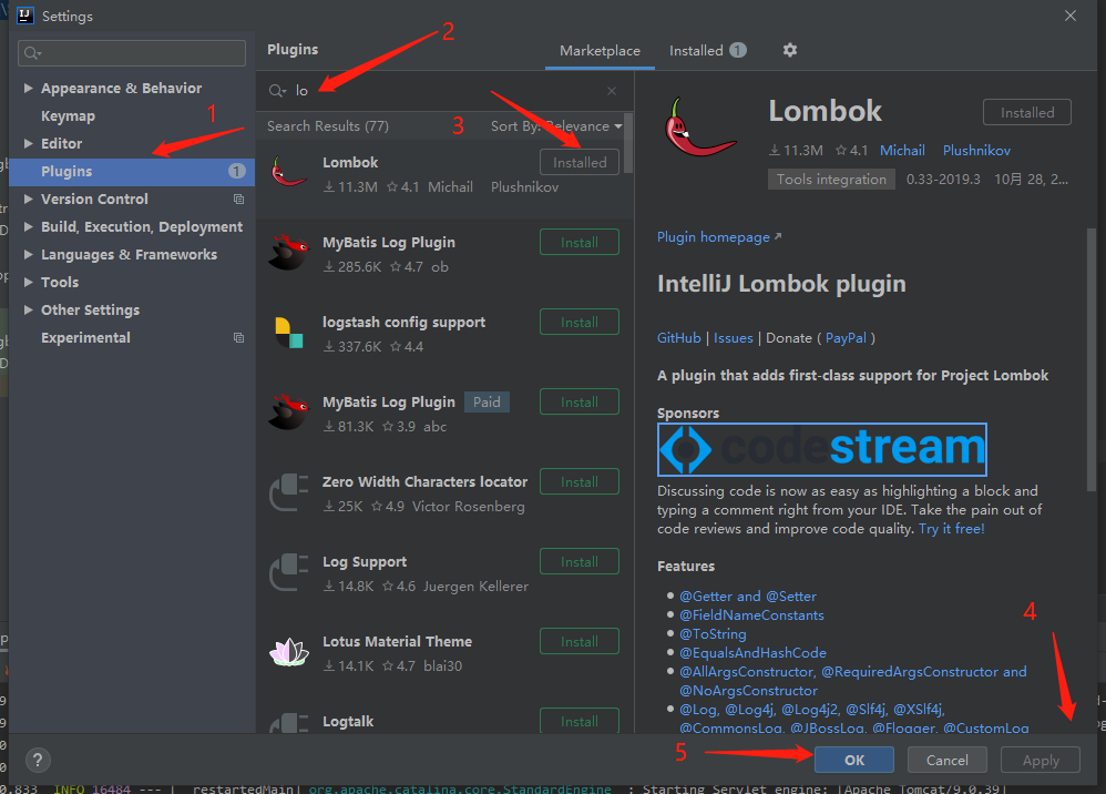 选择Plugins >收索 lombok >install >Apply>OK