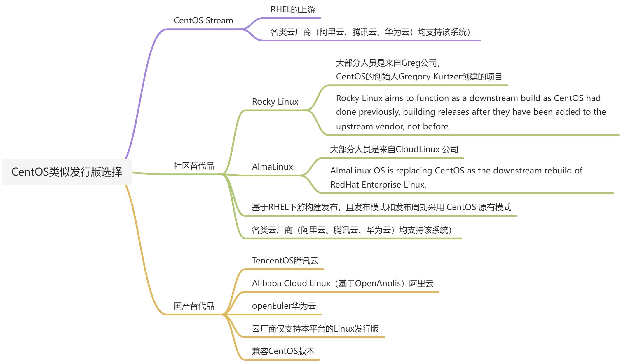 根据现状,我们可以选择Rocky Linux、AlmaLinux和云厂商发行版三种。