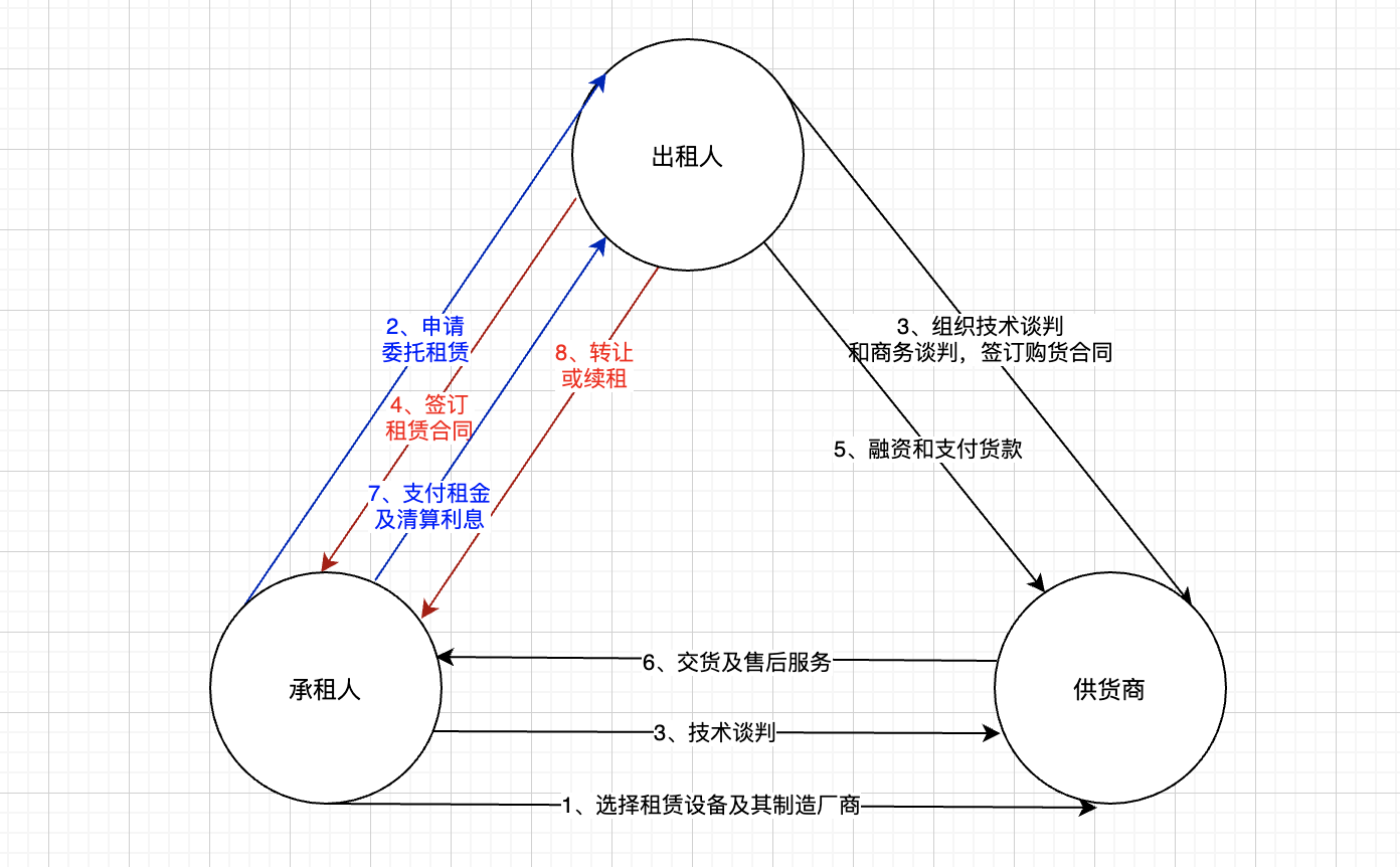 在租赁公司参与的情况下,承租人与设备厂商进行技术谈判,主要包括设备造型、质量保证、零配件交货期、技术培训、安装调试以及技术服务等方面。同时,租赁公司与设备厂商进行商务谈判,主要包括设备的价款、计价币种、运输方式、供货方式等方面。承租珍与设备厂商签订技术服务协议,租赁公司与设备厂商签订购货合同。
