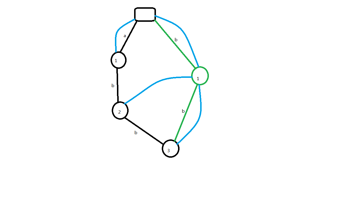 注意到由于ab最长后缀也找不到,所以pre同样指回根节点,而考虑到b也是一个后缀的开头,所以要补全根节点到b的出边