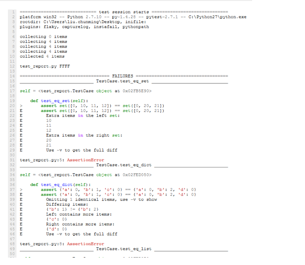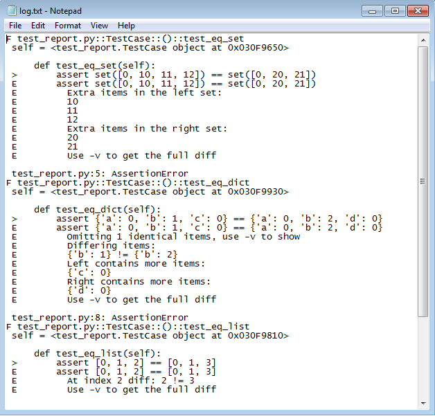 import py.test class TestCase(object): def test_eq_set(self): assert set([0, 10, 11, 12]) == set([0, 20, 21]) def test_eq_dict(self): assert {'a': 0, 'b': 1, 'c': 0} == {'a': 0, 'b': 2, 'd': 0} def test_eq_list(self): assert [0, 1, 2] == [0, 1, 3] def test_eq_longer_list(self): assert [1,2] == [1,2,3]