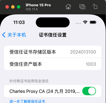 在iPhone中打开通用->关于本机->证书信任设置->开启对Charles证书的信任。