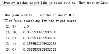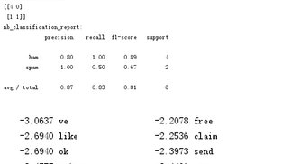 import nltk from nltk.corpus import stopwords from nltk.stem import WordNetLemmatizer #预处理 def processing(text): text=text.decode("UTF-8") tokens=[word for sent in nltk.sent_tokenize(text) for word in nltk.word_tokenize(sent)] stops=stopwords.words("english") tokens=[token for token in tokens if token not in stops] tokens=[token.lower() for token in tokens if len(token)>=3] lmtzr=WordNetLemmatizer() tokens=[lmtzr.lemmatize(token) for token in tokens] preprocessed_text=''.join(tokens) return preprocessed_text #读取文件 import csv file_path=r'SMSSpamCollectionjsn.txt' sms=open(file_path,'r',encoding='utf-8') sms_data=[] sms_label=[] csv_reader=csv.reader(sms,delimiter='\t') for line in csv_reader: sms_label.append(line[0]) sms_data.append(line[1]) sms.close() #按0.7:0.3比例分为训练集和测试集 import numpy as np sms_data=np.array(sms_data) sms_label=np.array(sms_label) from sklearn.model_selection import train_test_split x_train,x_test,y_train,y_test=train_test_split(sms_data,sms_label,test_size=0.3,random_state=0,stratify=sms_label) # print(len(sms_data),len(x_train),len(x_test)) # print(x_train) #将其向量化 from sklearn.feature_extraction.text import TfidfVectorizer vectorizer=TfidfVectorizer(min_df=2,ngram_range=(1,2),stop_words='english',strip_accents='unicode',norm='l2') X_train=vectorizer.fit_transform(x_train) X_test=vectorizer.transform(x_test) #分类结果显示 from sklearn.naive_bayes import MultinomialNB clf=MultinomialNB().fit(X_train,y_train) y_nb_pred=clf.predict(X_test) #分类结果显示 from sklearn.metrics import confusion_matrix from sklearn.metrics import classification_report #x_test预测结果 # print(y_nb_pred.shape,y_nb_pred) #混淆矩阵 print('nb_confusion_matrix:') cm=confusion_matrix(y_test,y_nb_pred) print(cm) #主要分类指标的文本报告 print('nb_classification_report:') cr=classification_report(y_test,y_nb_pred) print(cr) #出现过的单词列表 feature_names=vectorizer.get_feature_names() #先验概率 coefs=clf.coef_ intercept=clf.intercept_ coefs_with_fns=sorted(zip(coefs[0],feature_names)) n=10 top=zip(coefs_with_fns[:n],coefs_with_fns[:-(n+1):-1]) for (coef_1,fn_1),(coef_2,fn_2) in top: print('\t%.4f\t%-15s\t\t%.4f\t%-15s' % (coef_1,fn_1,coef_2,fn_2)) #输出不为零 print(len(x_train),len(x_test)) print(X_train.shape,X_test.shape) a = X_train.toarray() for i in range(100): for j in range(6608): if a[i, j] != 0: print(i, j, a[i, j]) print(vectorizer.get_feature_names()[4637])