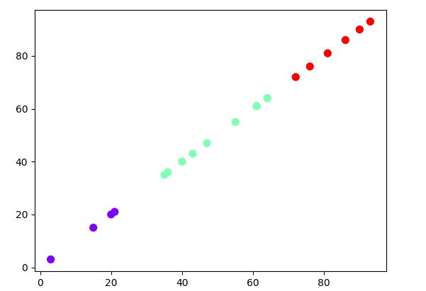 plt.scatter(x, x, c=y, s=50, cmap="rainbow");