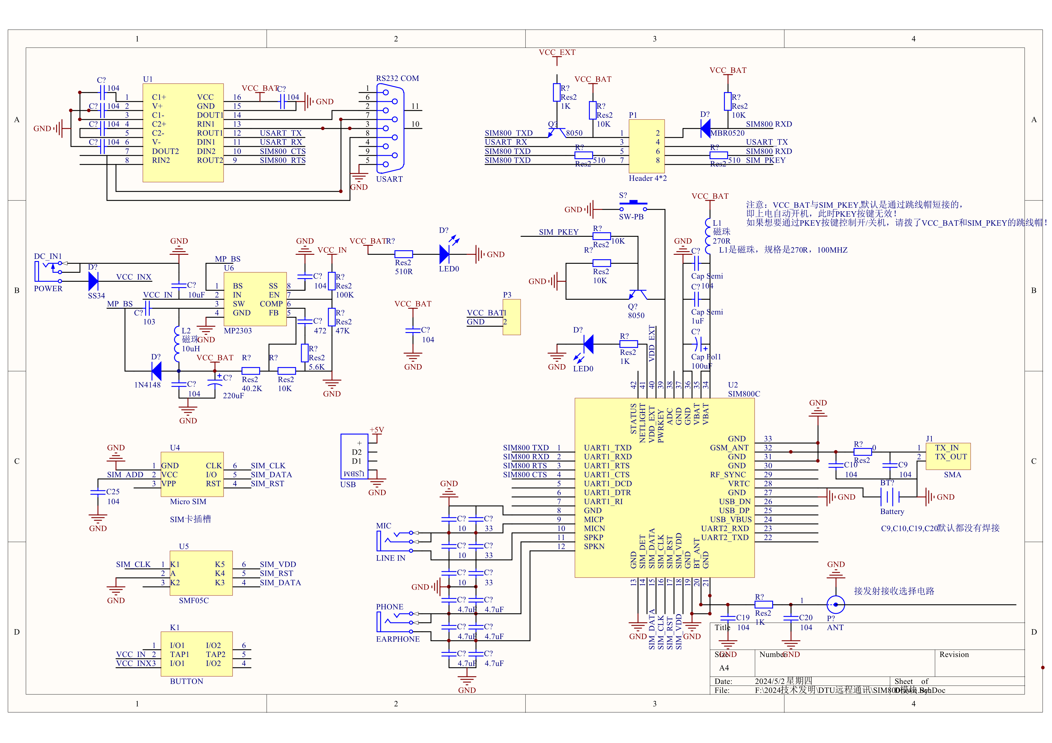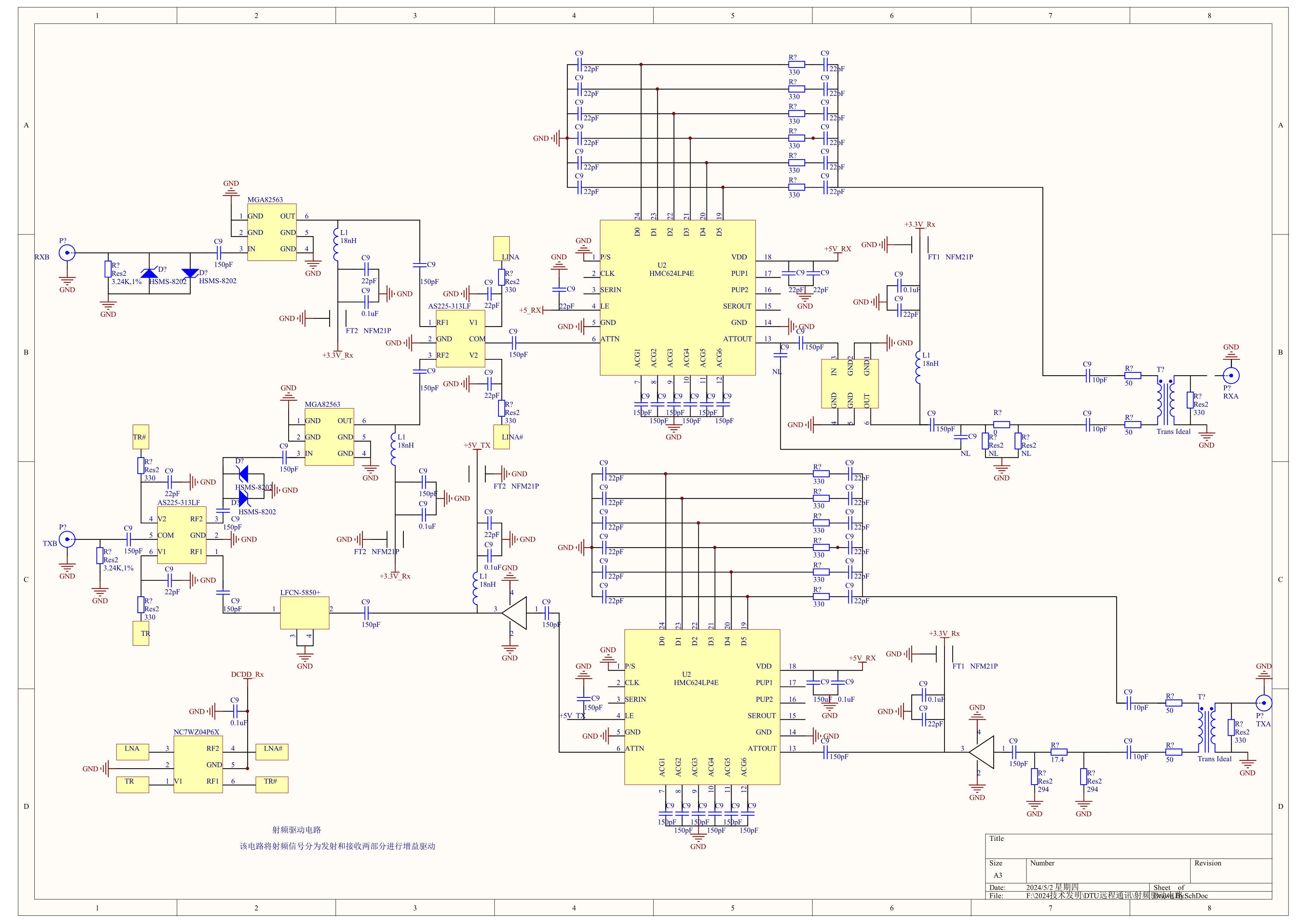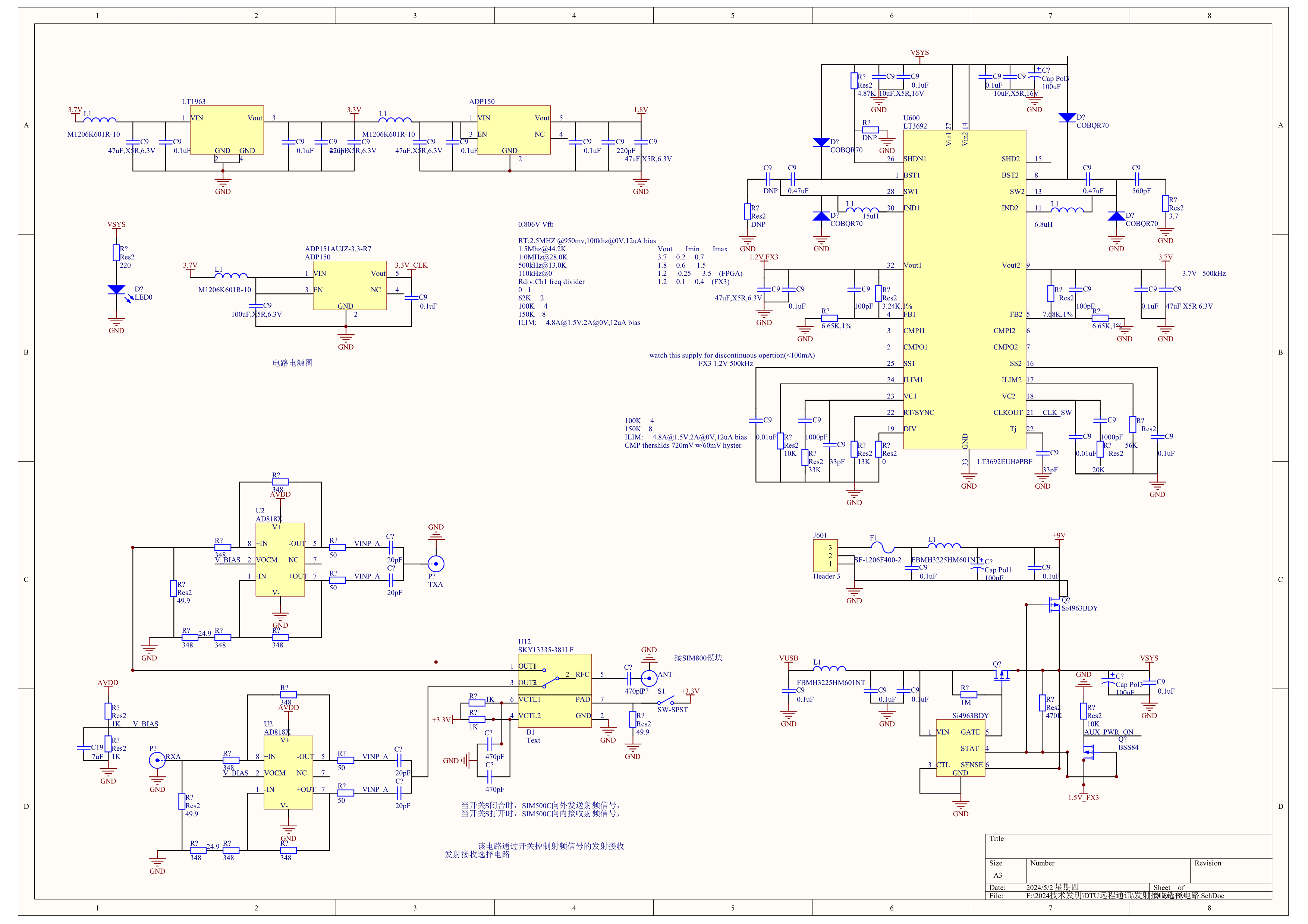 该电路将DTU模块SIM800C的射频信号,经过芯片SKY13335-381LF把发射接收信号分离,经过芯片HMC624LP4E放大驱动,通过JMD1无线电台电路发射出去。这样就增大了DTU模块的通讯距离。该电路的相关下载网址是: