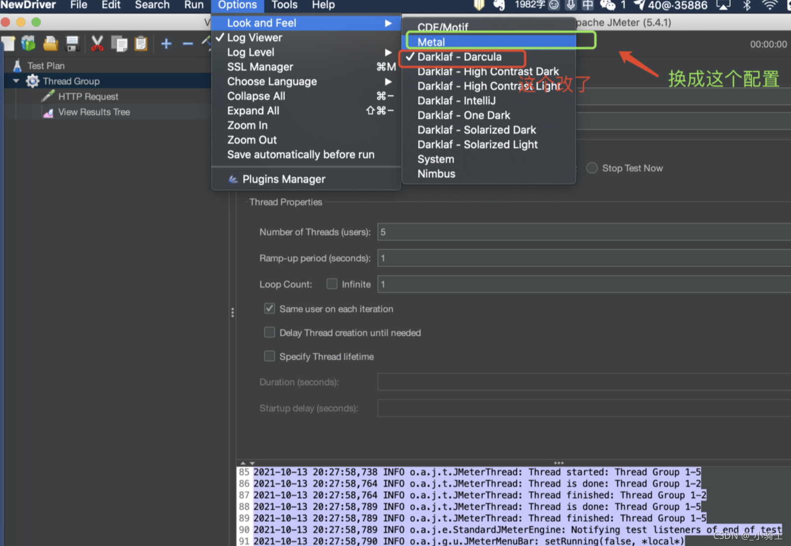 先看error,可以看到ERROR o.a.j.JMeter: Uncaught exception in thread Thread[AWT-EventQueue-0,6,main],接着往下看可以看到darkfilexxx等相关字段。直接把dark皮肤换了就可以解决了,见下图: