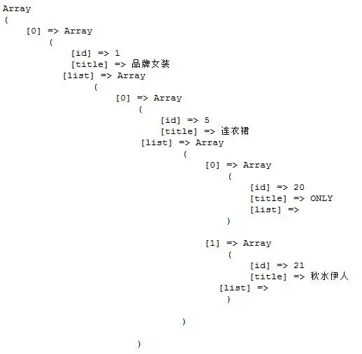 函数get_array()返回了数组,这是我们期待的,所以笔者推荐使用get_array()得到数组,这样一来,我们可以对数组进行任意操作,比如我们可以将数组转换成json格式的数据传给前端页面,前端页面可以通过解析json数据灵活展示分类信息。比如树形结构的分类列表,下拉分类列表等。
