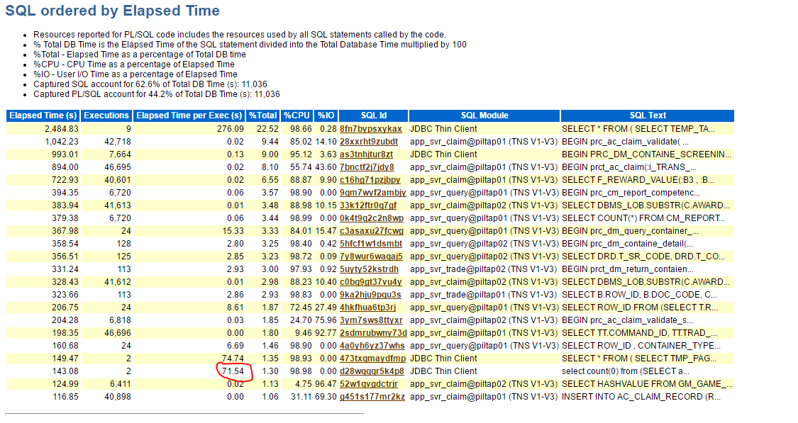 与运维确认该报表对应的SQL,生成出故障时间段的awr报表。在awr报告中显示执行时长为71.54S