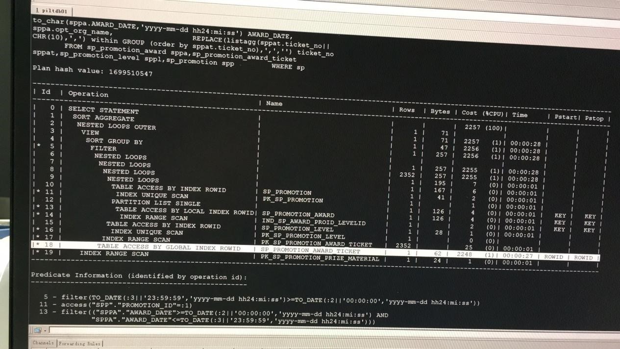 该表有一主键,执行计划的第17行就是走的该表主键对应的全局唯一性索引,并且是组合索引,索引列为:PROMOTION_ID, PROMOTION_LEVEL_ID, TICKET_NO。