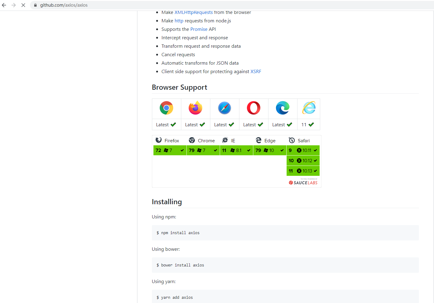 我们查看一下 axios的github的官方地址:axios的Github地址(这个里面有很详细的axios的使用方法),也可以在 百度文本框: GitHub axios。