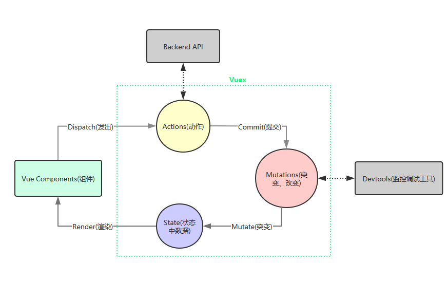 1. Vue组件上操作,会发出(dispatch)一个动作(actions) -> 2. 提交(commit) 改变(mutation)的数据 -> 3.突变或者说改变(mutate) 状态(state)中的数据 -> 4.改变之后,重新渲染(render)组件(Vue Components) ->5.组件就会更新,展示更新过后的数据。