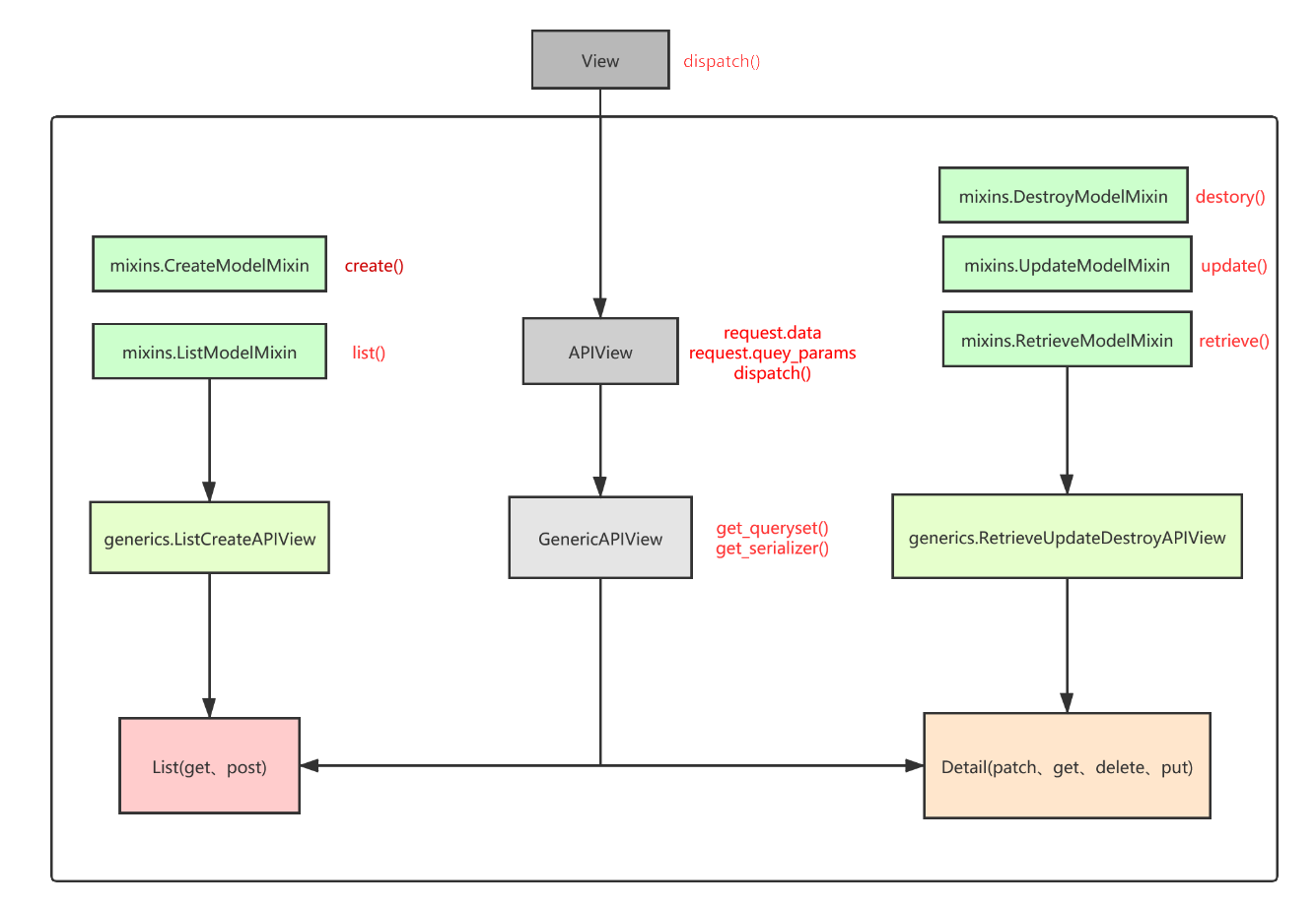 generics.GenericAPIView(继承APIView,提供queryset = None、serializer_class = None) generics.ListCreateAPIView(继承mixins.ListModelMixin、mixins.CreateModelMixin、generics.GenericAPIView) generics.RetrieveUpdateDestroyAPIView(继承mixins.RetrieveModelMixin,mixins.UpdateModelMixin,mixins.DestroyModelMixin,generics.GenericAPIView)