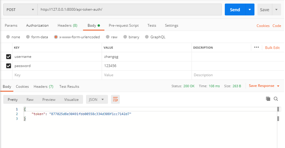 1、POST方法:请求http://127.0.0.1:8000/api-token-auth/ 获取token值。