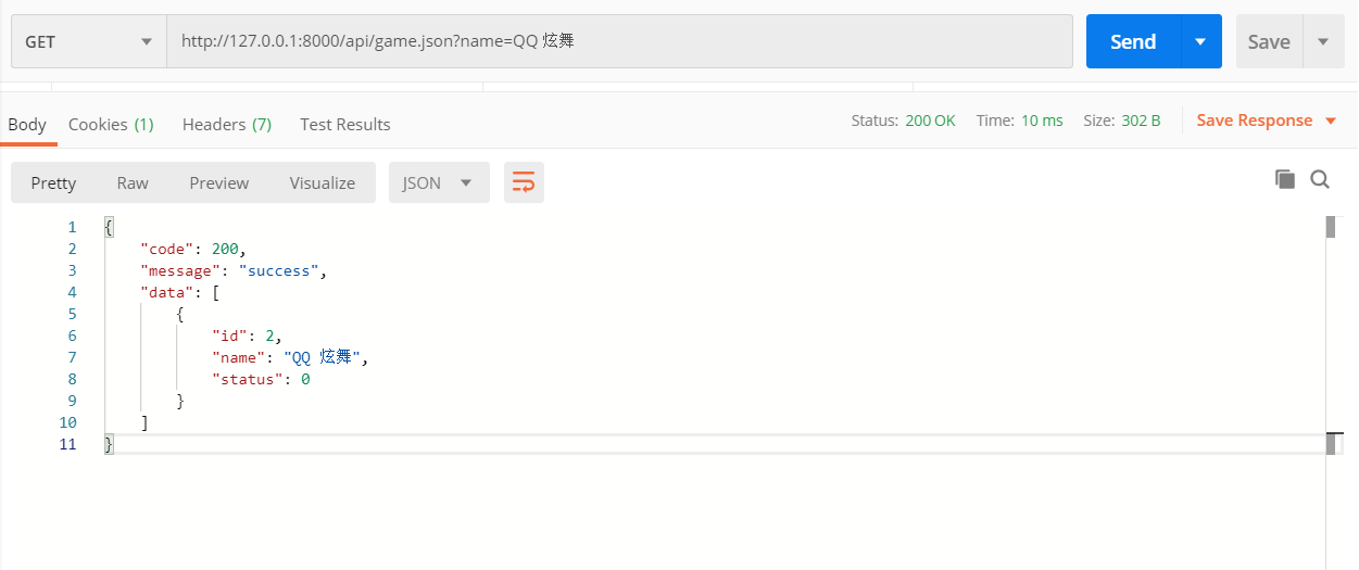 单个搜索:127.0.0.1:8000/api/game.json?name=QQ 炫舞