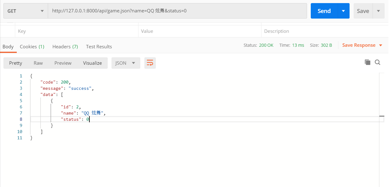 组合搜索:127.0.0.1:8000/api/game.json?name=QQ 炫舞&status=0