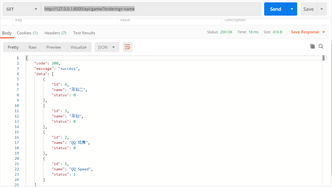 降序:http://127.0.0.1:8000/api/game/?ordering=-id,会根据id降序。