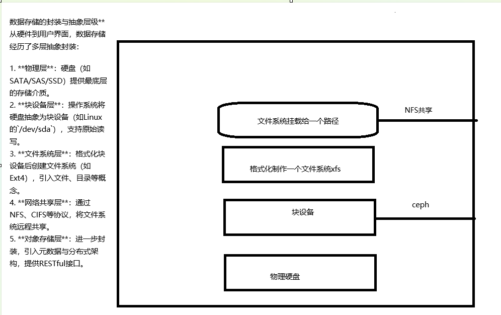 对象存储:存储数据单位是一个个的对象,真正要存数据一定是要存到,在计算机体系中,数据要么存到内存要么存在硬盘,永久存储一定是存到硬盘里面,存储可以有不同的形式无非就是在硬盘设备之上进行一层层封装,随着一层层封装到最后展示的形式是不一样的。用一块硬盘的时候装了操作系统,用文件,文件是操作系统提供的,Linux操作系统一切皆文件,硬盘关联到操作系统的文件名都是dev下的sd开头的,sda块设备,物理硬盘需要关联块设备才能用,这个块设备需要格式化制作一个文件系统,做完文件系统挂载一个文件夹里面就可以写文件或者文件夹了。用NFS的时候用的就是文件夹里面有现成的文件。