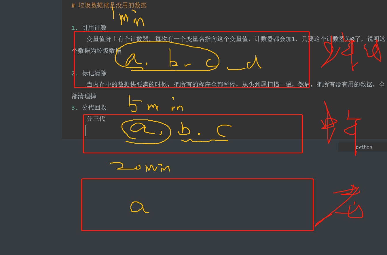 分代回收是一种以空间换时间的操作方式,Python将内存根据对象的存活时间划分为不同的集合,每个集合称为一个代,Python将内存分为了3“代”,分别为年轻代(第0代)、中年代(第1代)、老年代(第2代),他们对应的是3个链表,它们的垃圾收集频率与对象的存活时间的增大而减小。新创建的对象都会分配在年轻代,年轻代链表的总数达到上限时,Python垃圾收集机制就会被触发,把那些可以被回收的对象回收掉,而那些不会回收的对象就会被移到中年代去,依此类推,老年代中的对象是存活时间最久的对象,甚至是存活于整个系统的生命周期内。同时,分代回收是建立在标记清除技术基础之上。分代回收同样作为Python的辅助垃圾收集技术处理那些容器对象.