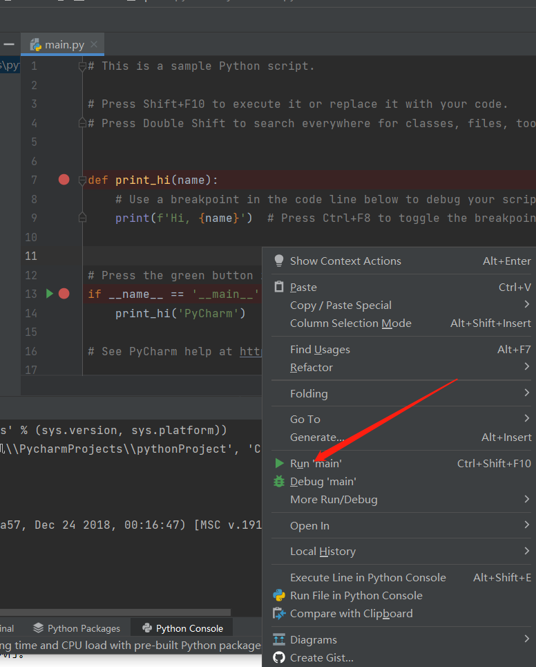在编辑区域,右键,选择run 文件名