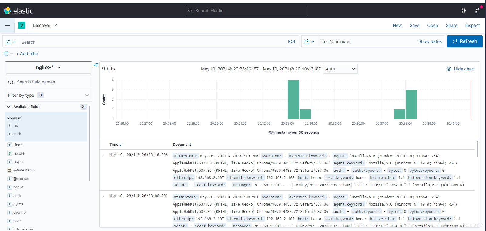 Next step->Time field(@timestamp)->Create index pattern 即可