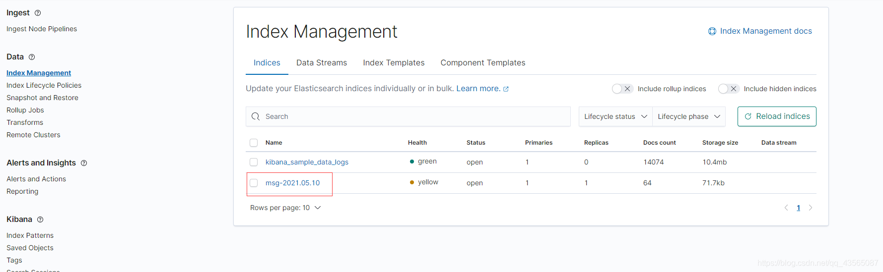 Settings->Indices->Log indices (将其中default的内容改为msg-*)->Apply