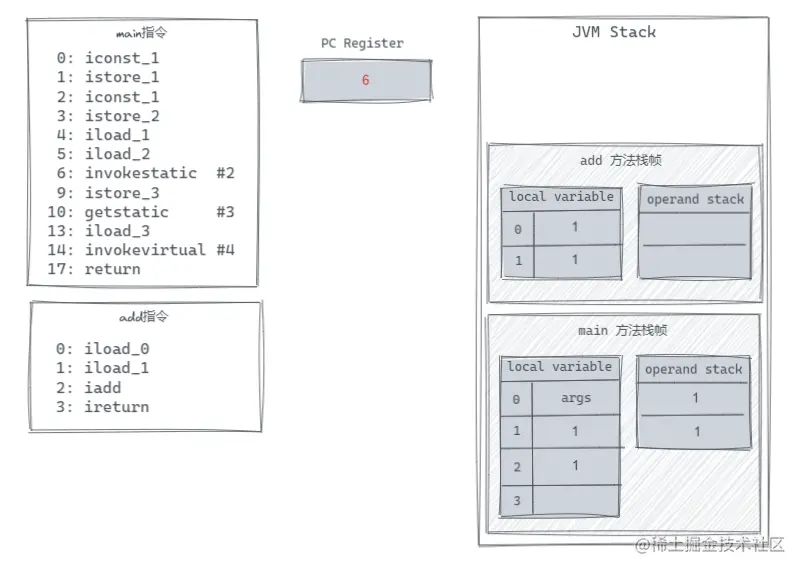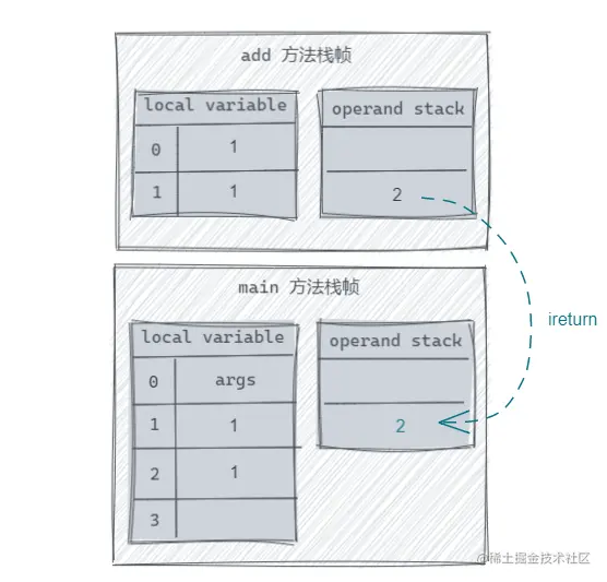之后开始执行 add() 方法中的指令,首先执行的是两个 iload 指令,将 loca variable 对应下标的变量的值放到 operand stack 中,之后执行 iadd 取出 operand stack 中的值并进行加法运算,再把结果放到add方法栈帧中的操作数栈,最后执行 ireturn 取出 operand stack 顶部的 int 值进行返回。
