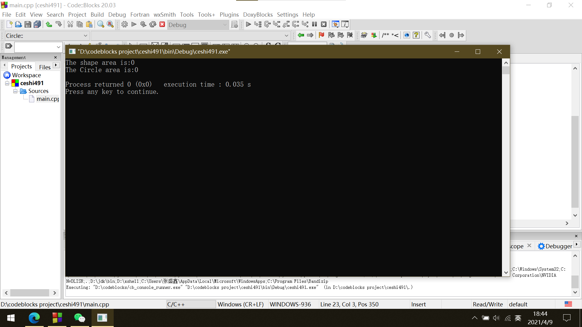 1 #include <iostream> 2 using namespace std; 3 const double PI = 3.1415926; 4 5 class Shape 6 { 7 public: 8 double Area() 9 { 10 return 0; 11 } 12 }; 13 class Circle : public Shape 14 { 15 public: 16 Circle(double radius=100):radius(radius){} 17 double Area() 18 { 19 return (PI * radius * radius); 20 } 21 private: 22 double radius; 23 }; 24 int main() 25 { 26 Shape a; 27 Circle b(10); 28 Shape *p = NULL; 29 30 p = &a; 31 cout << "The shape area is:" << p->Area() << endl; 32 33 p = &b; 34 cout << "The Circle area is:" << p->Area() << endl; 35 36 return 0; 37 }