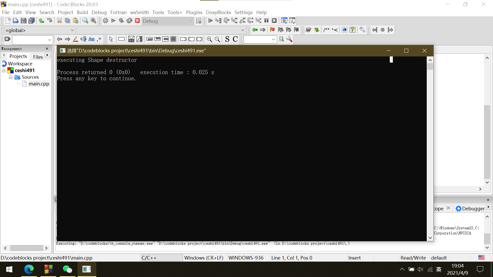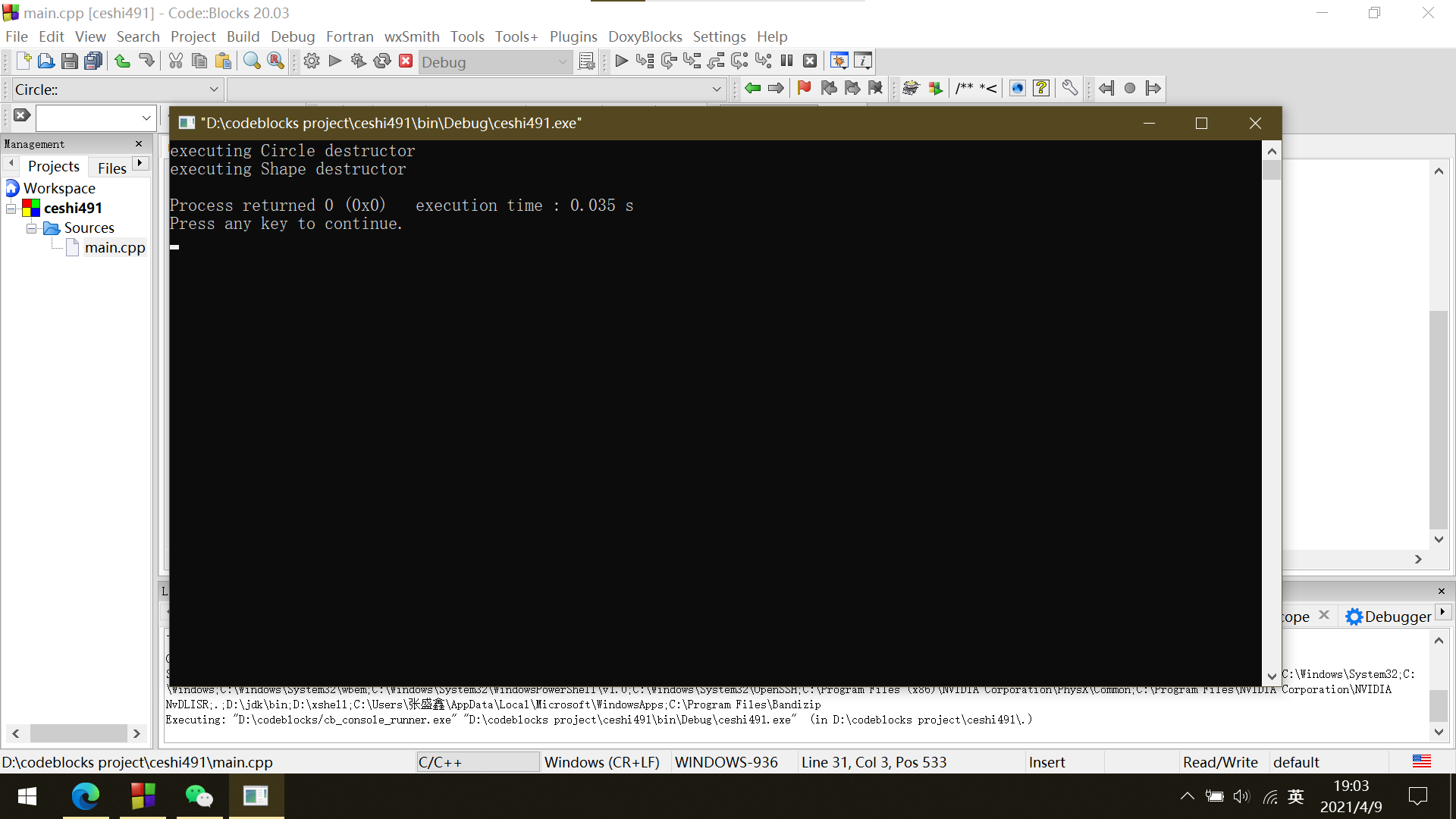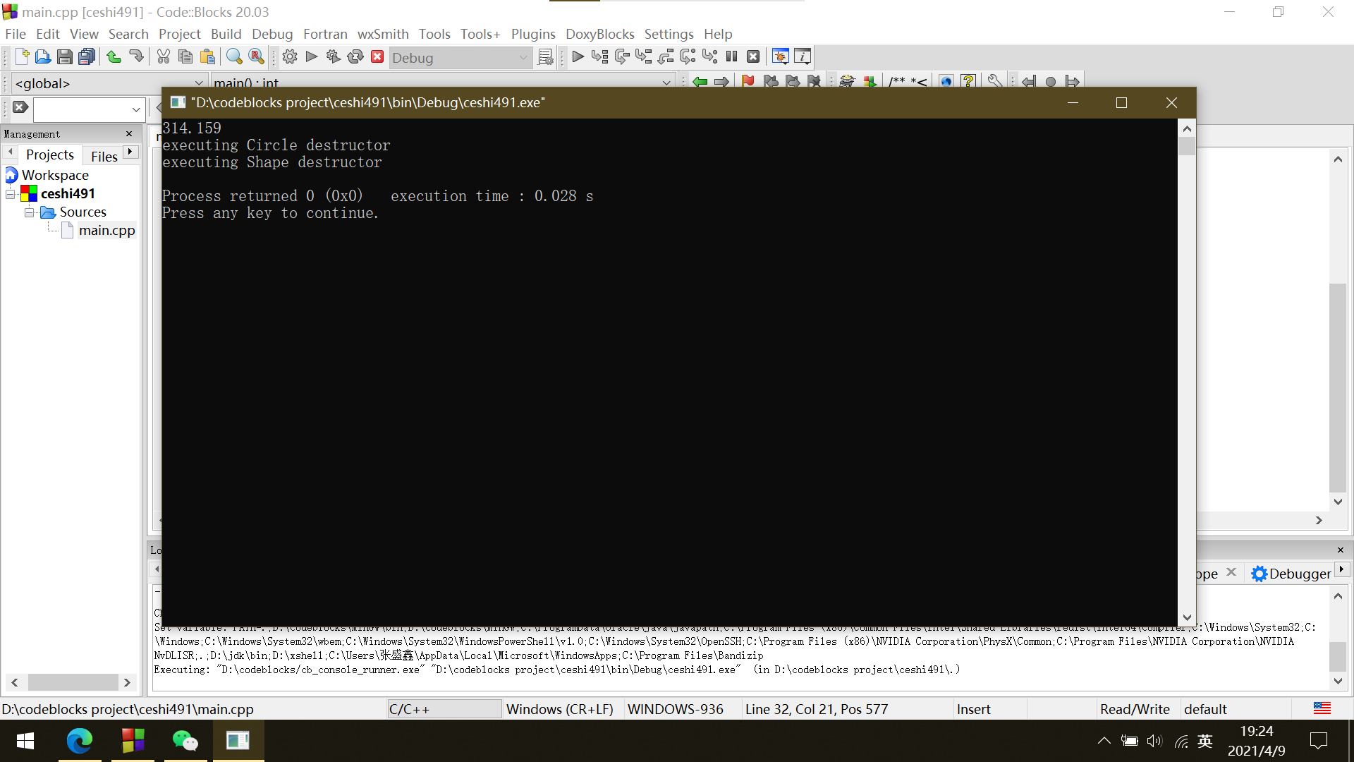 1 #include <iostream> 2 using namespace std; 3 const double PI = 3.1415926; 4 5 class Shape 6 { 7 public: 8 double Area() 9 { 10 return 0; 11 } 12 ~Shape() 13 { 14 cout << "executing Shape destructor" <<endl; 15 } 16 }; 17 class Circle : public Shape 18 { 19 public: 20 Circle(double radius=100):radius(radius){} 21 double Area() 22 { 23 return (PI * radius * radius); 24 } 25 ~Circle() 26 { 27 cout << "executing Circle destructor" << endl; 28 } 29 private: 30 double radius; 31 }; 32 int main() 33 { 34 Shape *p = NULL; 35 p = new Circle; 36 delete p; 37 38 return 0; 39 }