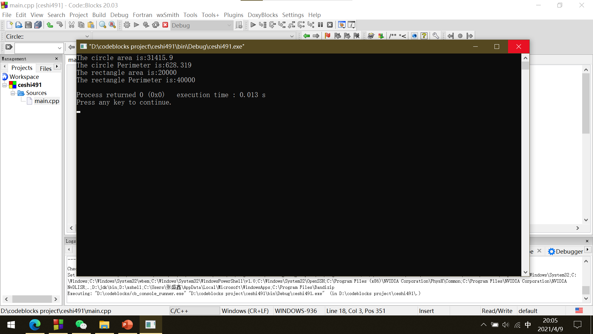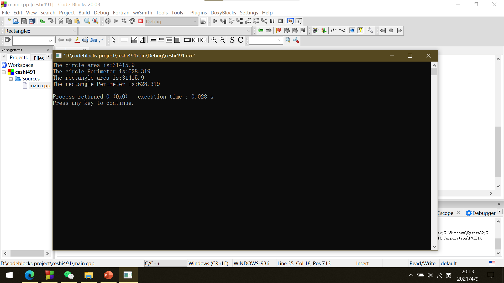 1 #include <iostream> 2 using namespace std; 3 const double PI = 3.1415926; 4 class Shape 5 { 6 public: 7 virtual double Area() = 0; 8 virtual double Perimeter() = 0; 9 }; 10 class Circle:public Shape 11 { 12 public: 13 Circle(double radius = 0):radius(radius){} 14 virtual double Area(); 15 virtual double Perimeter(); 16 private: 17 double radius; 18 }; 19 double Circle::Area() 20 { 21 return (PI * radius * radius); 22 } 23 double Circle::Perimeter() 24 { 25 return (2 *PI * radius); 26 } 27 class Rectangle:public Shape 28 { 29 public: 30 Rectangle(double length = 0,double width = 0):length(length),width(width){} 31 virtual double Area(); 32 virtual double Perimeter(); 33 private: 34 double length; 35 double width; 36 }; 37 double Rectangle::Area() 38 { 39 return (length * width); 40 } 41 double Rectangle::Perimeter() 42 { 43 return (2 * length * width); 44 } 45 int main() 46 { 47 Circle a(100); 48 Shape &p=a; 49 50 51 cout <<"The circle area is:" << p.Area() << endl; 52 cout <<"The circle Perimeter is:" << p.Perimeter() <<endl; 53 Rectangle b(100,200); 54 p = b; 55 cout <<"The rectangle area is:" << p.Area() << endl; 56 cout << "The rectangle Perimeter is:" << p.Perimeter() <<endl; 57 return 0; 58 }