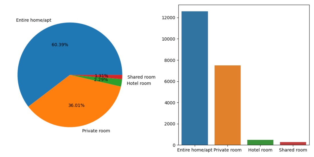 # 房间类型对比 room_type_counts = listings_detailed_df['room_type'].value_counts(); fig, axes = plt.subplots(1,2, figsize= (10,5)); # 饼图 axes[0].pie(room_type_counts.values, autopct = '%.2f%%', labels = room_type_counts.index); # 柱状图 sns.barplot(x = room_type_counts.index, y = room_type_counts.values); # 让两个图别有重叠处,进行调整 plt.tight_layout(); plt.show();