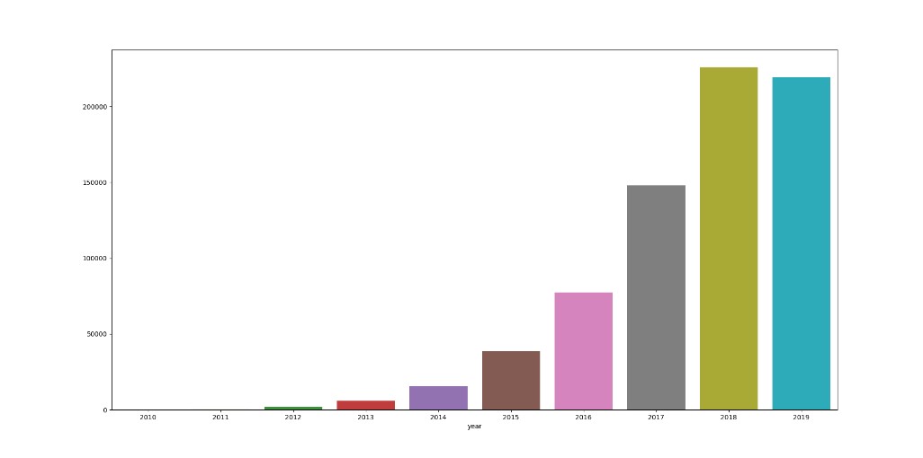 # 获取数据集,将date转换为日期类型 reviews = pd.read_csv('madrid-airbnb-data/reviews_detailed.csv', parse_dates=['date']); # 添加年月 reviews['year'] = reviews['date'].dt.year; reviews['month'] = reviews['date'].dt.month; # 按照年月对数据进行分组,查看哪一年/月的数据有多少 n_reviews_year = reviews.groupby('year').size(); sns.barplot(x = n_reviews_year.index, y = n_reviews_year.values); plt.show();