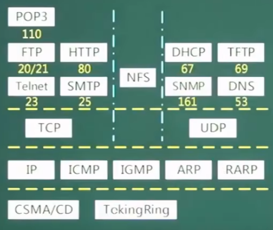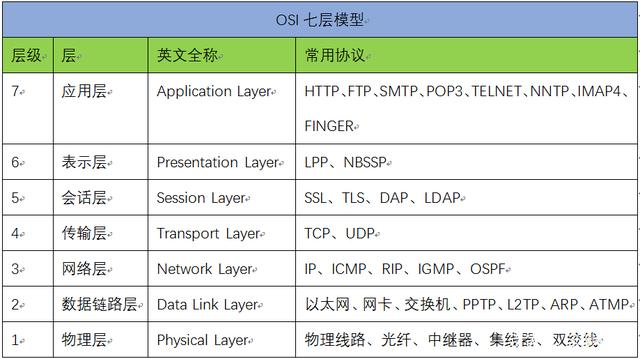 OSI七层模型从下到上依次为物理层、数据链路层、网络层、传输层、会话层、表示层、应用层。各层蝉蛹协议如下图(图片摘自百度图片)。