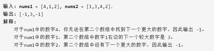 1 class Solution(object): 2 def nextGreaterElement(self, nums1, nums2): 3 """ 4 :type nums1: List[int] 5 :type nums2: List[int] 6 :rtype: List[int] 7 """ 8 result = [] 9 for item in nums1: 10 isok = True 11 begin = nums2.index(item) 12 while begin < len(nums2) and isok: 13 if nums2[begin] > item: 14 isok = False 15 result.append(nums2[begin]) 16 begin += 1 17 if isok == True: 18 result.append(-1) 19 return result